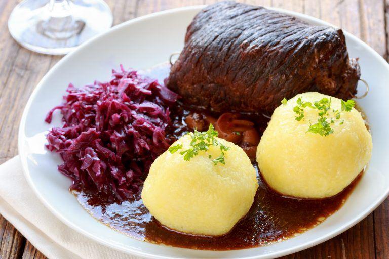 Desglasa todo con vino tinto y rellena con el caldo, agrega aquí tanto líquido que los rollitos apenas queden cubiertos, ahora también puedes agregar la mostaza restante. Deje que todo hierva brevemente y luego apague la estufa y déjelo hervir a fuego lento durante aproximadamente 1 1/2 a 2 horas con la tapa cerrada. Hacia el final del tiempo de cocción (después de aproximadamente 1 1/2 horas) revise los rollos una y otra vez para saber cuándo están tiernos.