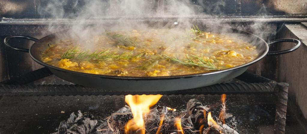 La paella valenciana se compone de arroz teñido de amarillo intenso con azafrán, verduras y carne blanca (pollo, conejo). La carne se corta con hueso en trozos del tamaño de un bocado. Ocasionalmente también se agregan pequeños caracoles. Los tomates troceados, los bajoquetes (habas verdes) y el garrofó (habas blancas grandes y planas) se suelen utilizar como verduras. Sazonado con sal, ajo fresco y azafrán. Ramitas de romero (fresco), que se colocan sobre el arroz durante los últimos minutos y, si es necesario, también se añaden al fuego, dando un toque mediterráneo adicional.